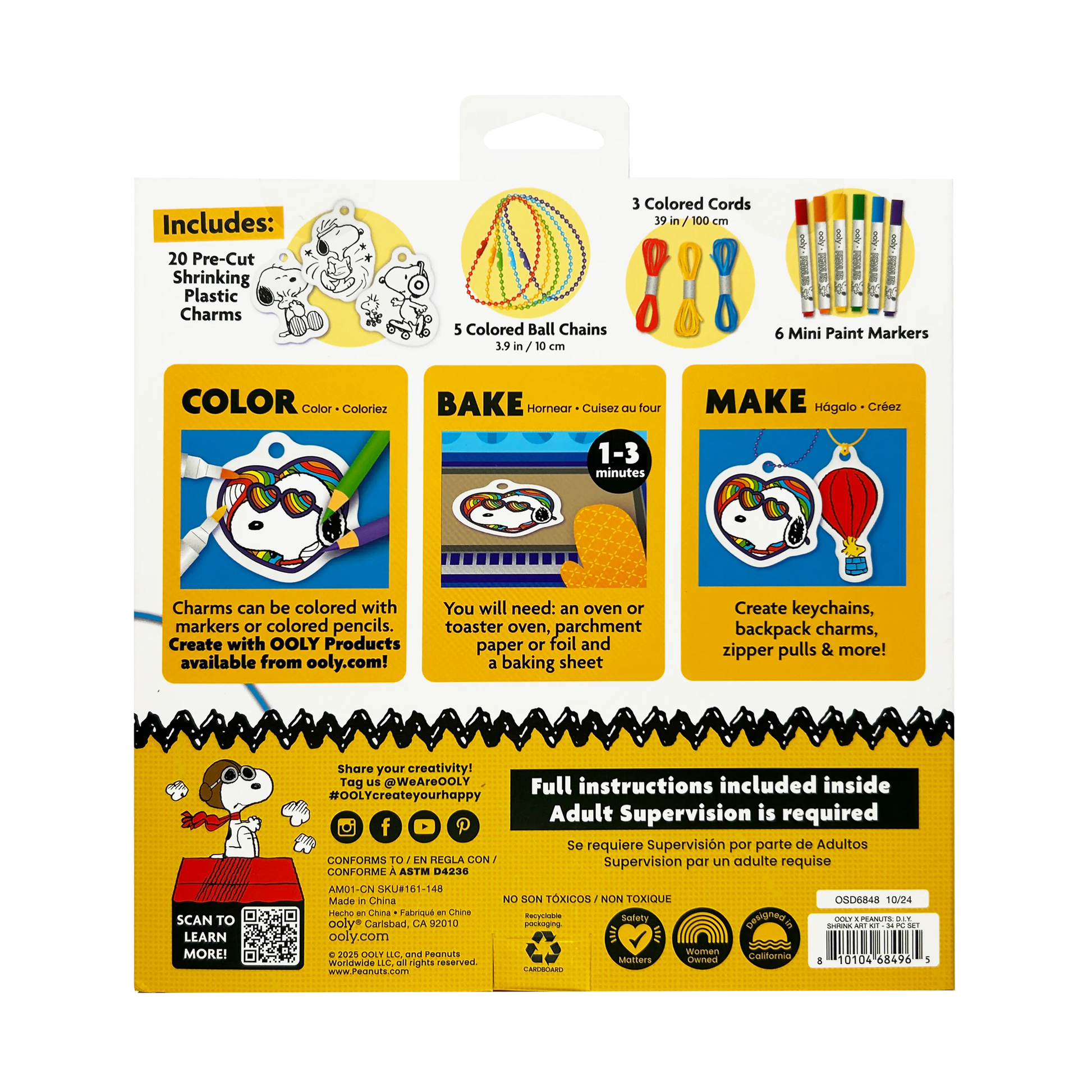Make your own Snoopy charm-making kit! The OOLY x Peanuts DIY Shrink Art Kit lets you create 20 colorful Snoopy charms that shrink down to accessory size when baked. Complete with ball chains, colored cords, and mini paint markers, this craft kit is perfect for kids and Snoopy fans alike.